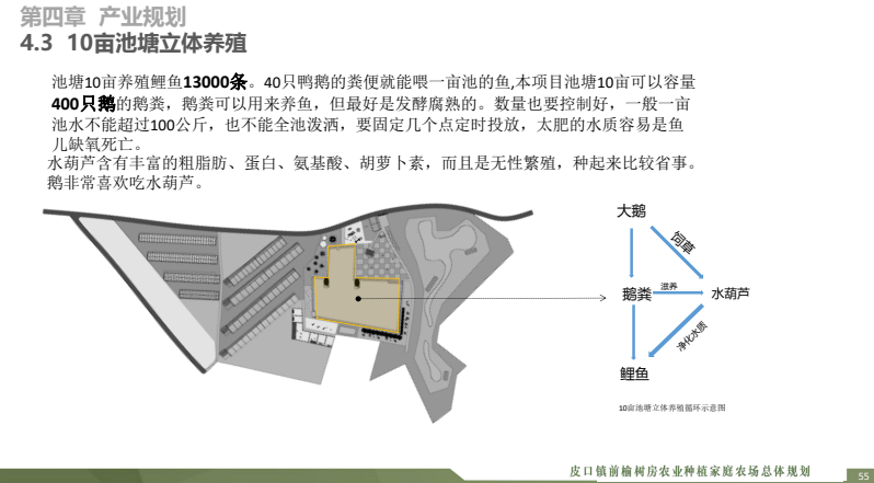 規(guī)劃范圍 本項目地址于大連市皮口鎮(zhèn)前榆樹 房??傄?guī)劃面積約為111畝。 (3)規(guī)劃期限 2021-2023,池塘10畝養(yǎng)殖鯉魚13000條。40只鴨鵝的糞便就能喂一畝池的魚,本項目池塘10畝可以容量